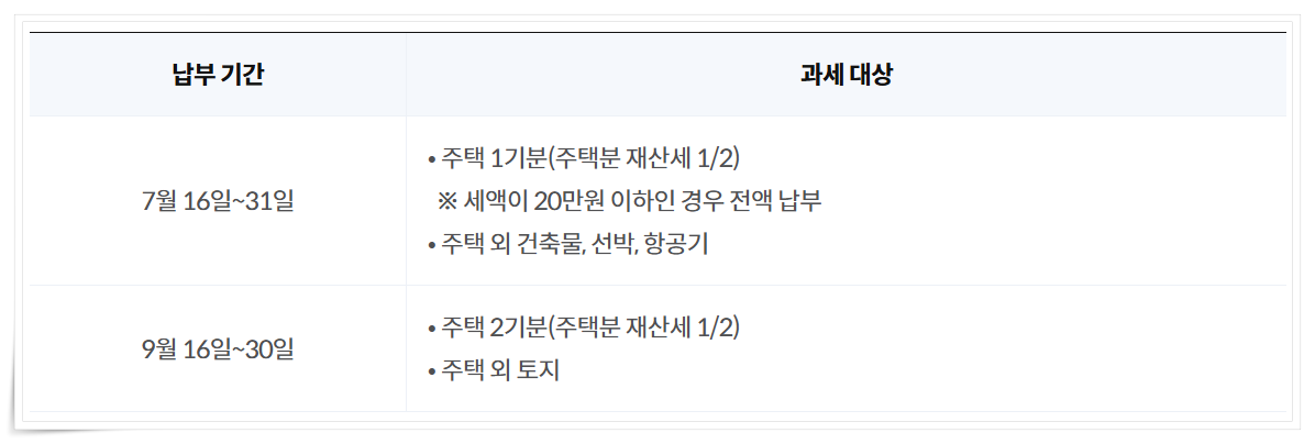 ✔️ 재산세는 재산 종류에 따라 납부 기간이 다릅니다.