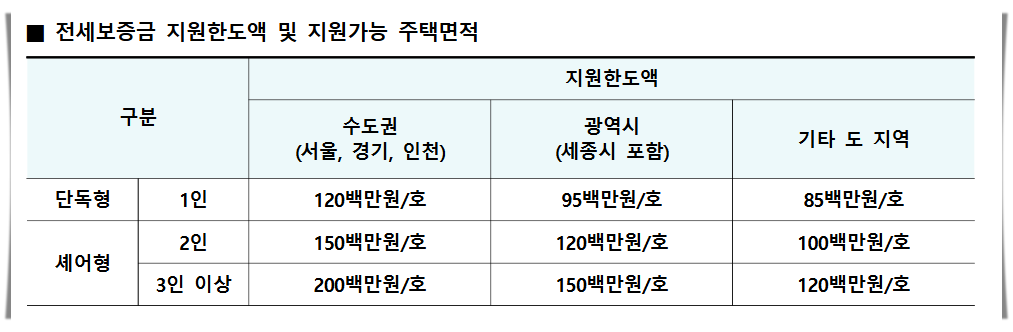전세보증금 지원한도액은 지역별로, 주택 유형별로 다르니 자세한 내용을 확인하시기 바랍니다.