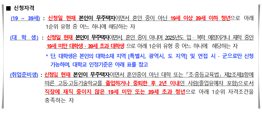 ✔️대학생신청일 기준으로 무주택자이면서, 미혼 상태인 사람으로, 2025년도 입학, 복학 예정이거나 재학 중인 19세 미만, 39세 초과 대학생을 말하고, 1순위 유형(수급자, 한부모가족, 차상위계층) 중 어느 하나에 해당하는 자입니다.